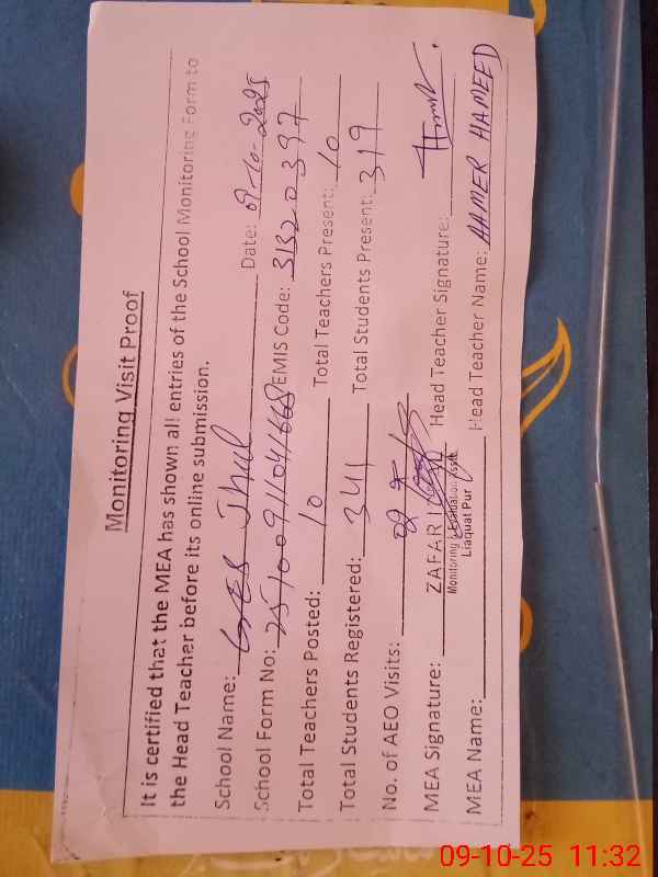 | Certified that this School was Inspected by the Undersigned MEA/DMO Today and the Information Stated Above is as Per Record. | |||||