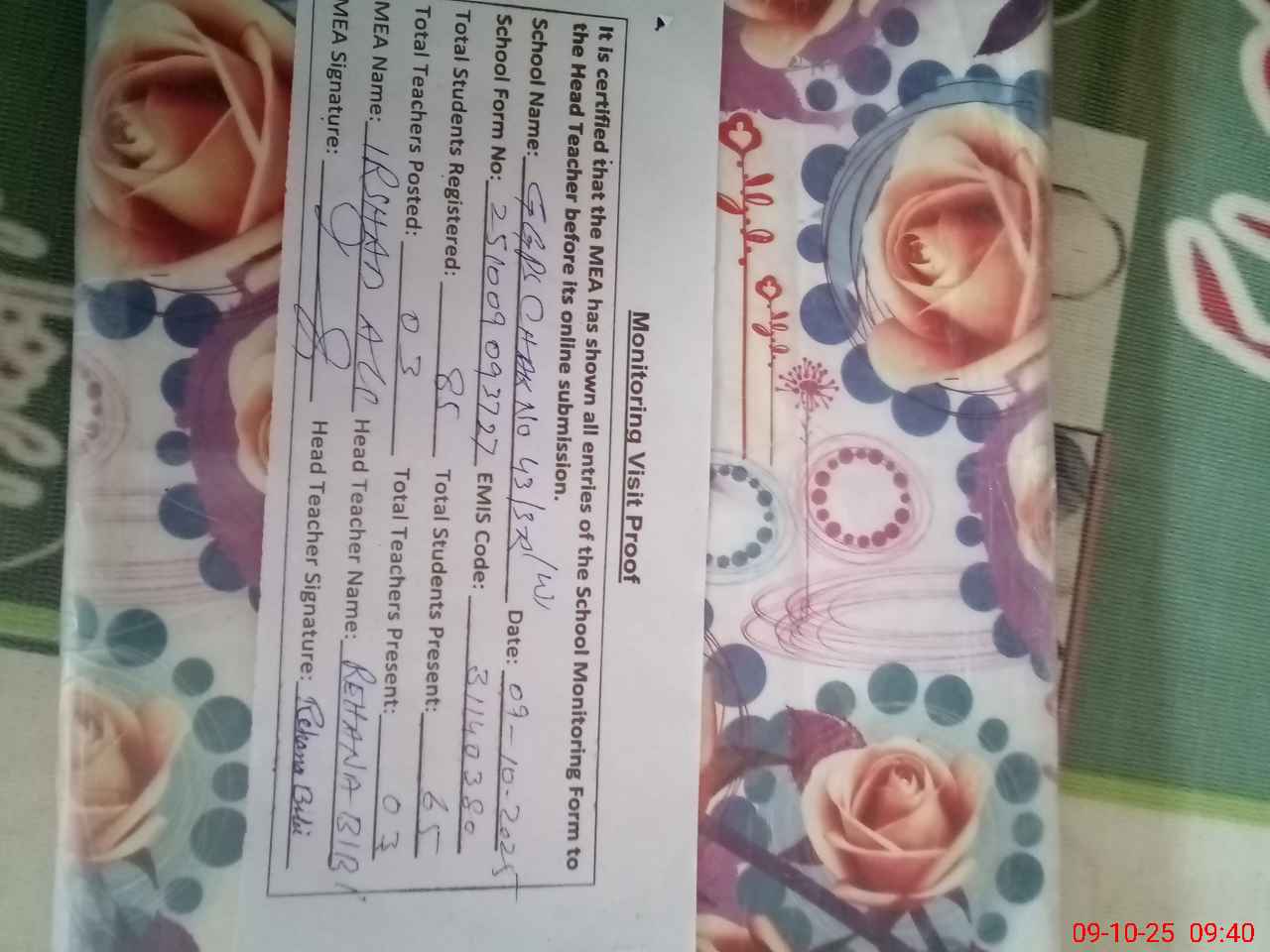 | Attendance Register | Head Teacher | MEA with School | Visit Proof |