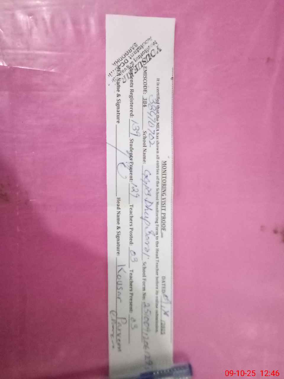 | Attendance Register | Head Teacher | MEA with School | Visit Proof |