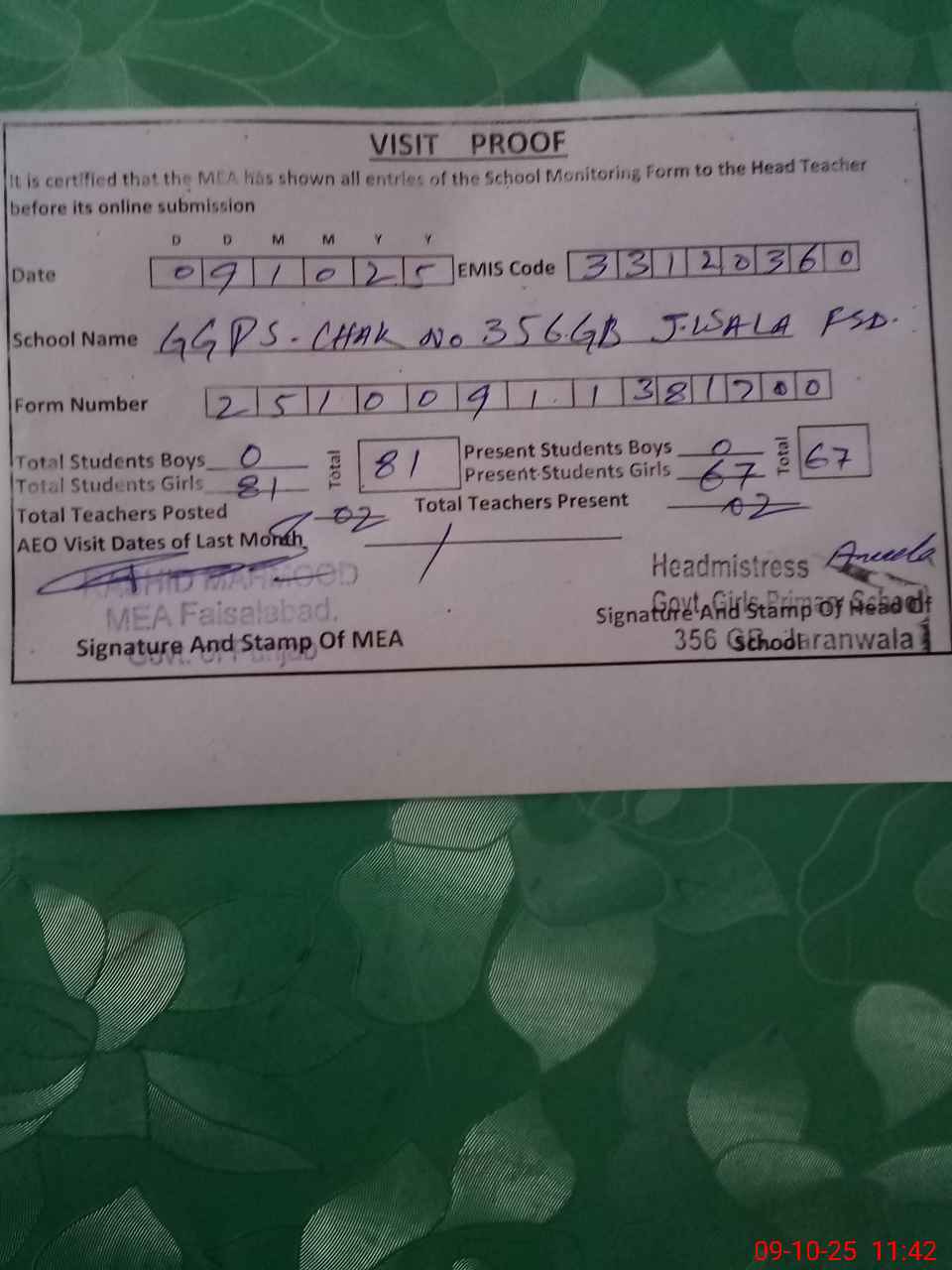 | Remarks (Use Separate Page if Required): School is not visited by the AEO in September 2025 | |||||