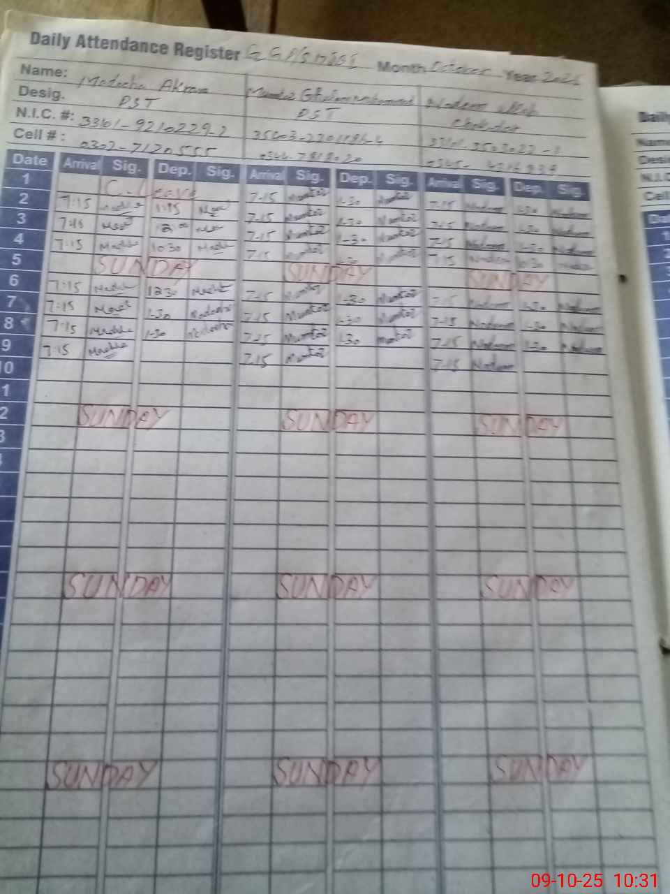 | CNIC | Full Name | Designation | R/C | Absence During Last Calender Month |