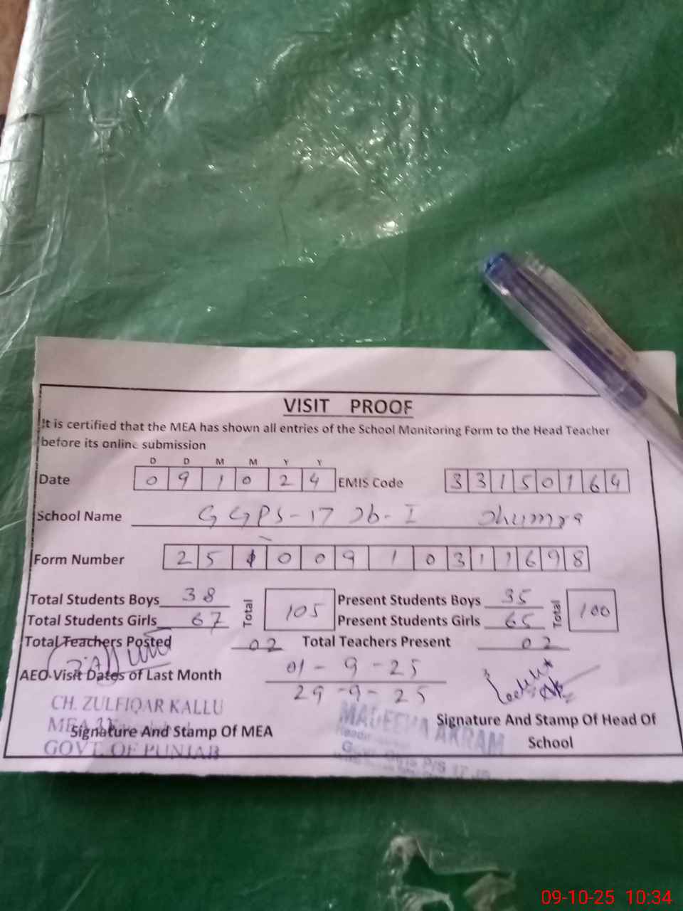 | Monitoring Date: 09-10-2025 | Start Time: 09-10-2025 10:04 AM | End Time: 09-10-2025 10:39 AM | Name of MEA: ZU**** AL**** | |