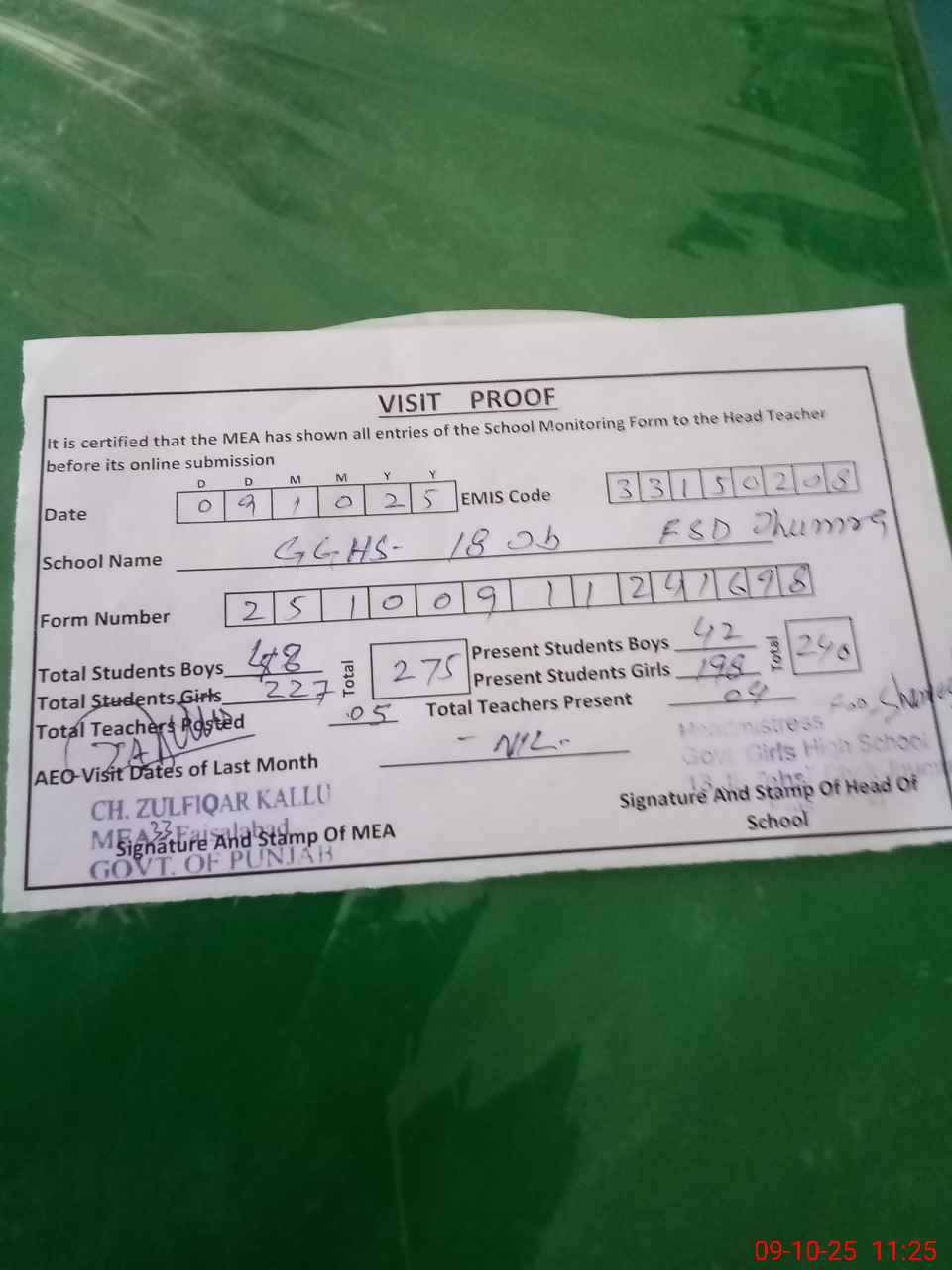 | EMIS Code: 33150208 | Name of School: GGHS CHAK NO. 18 JB | |||