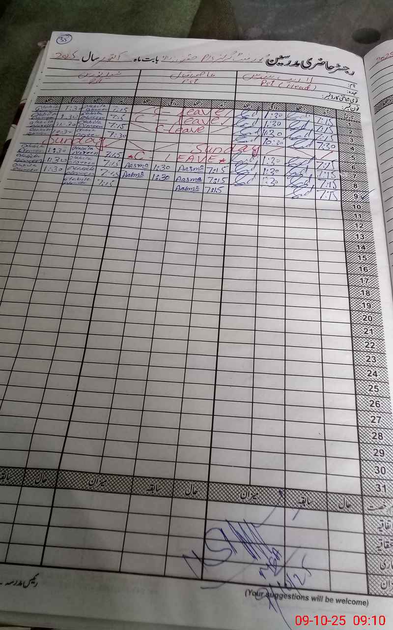 | CNIC | Full Name | Designation | R/C | Absence During Last Calender Month |