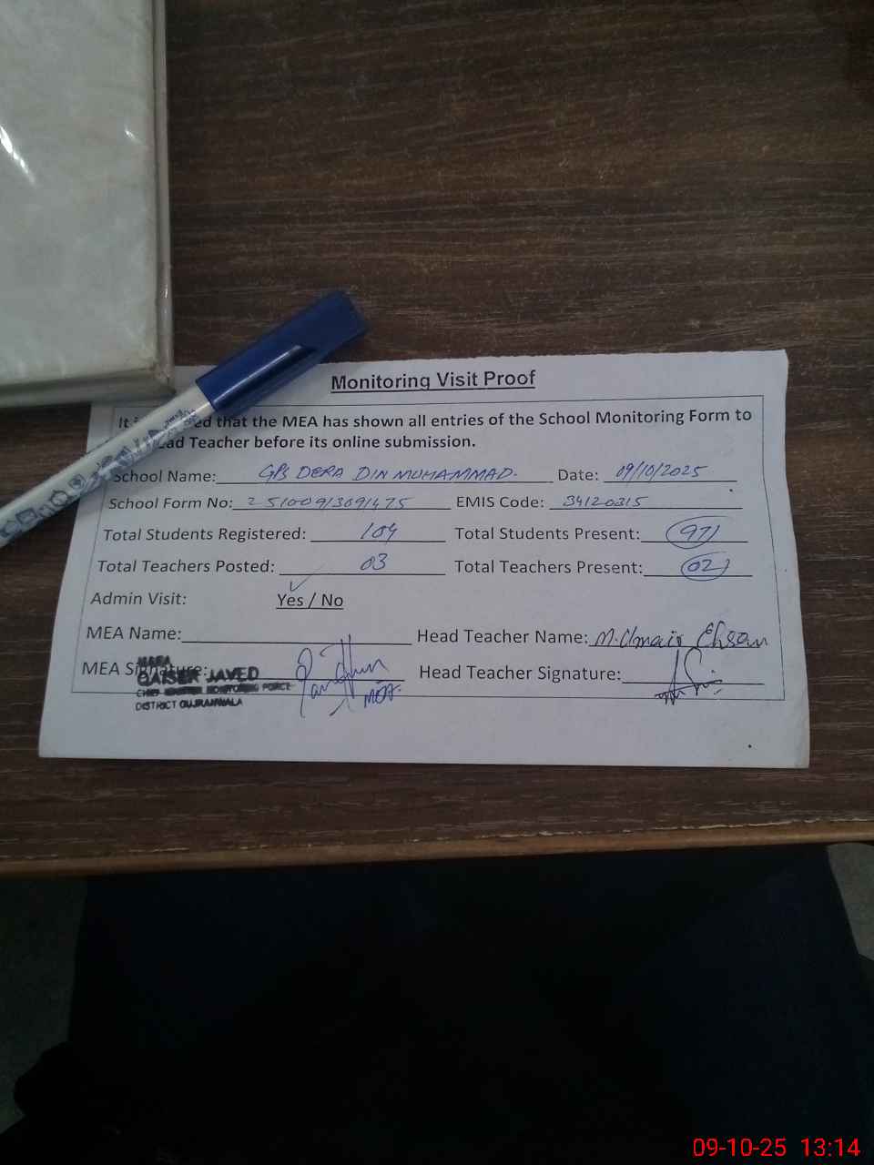 | Attendance Register | Head Teacher | MEA with School | Visit Proof |