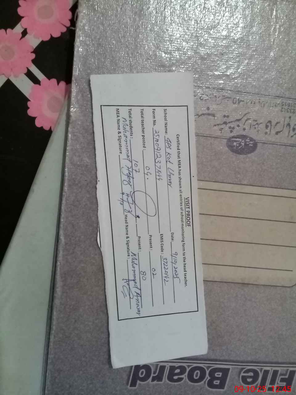 | Attendance Register | Head Teacher | MEA with School | Visit Proof |