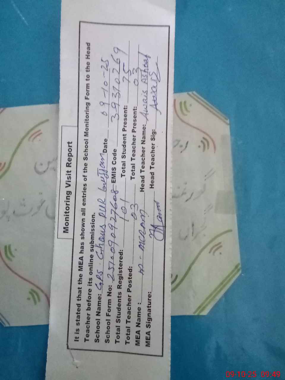 | Attendance Register | Head Teacher | MEA with School | Visit Proof |