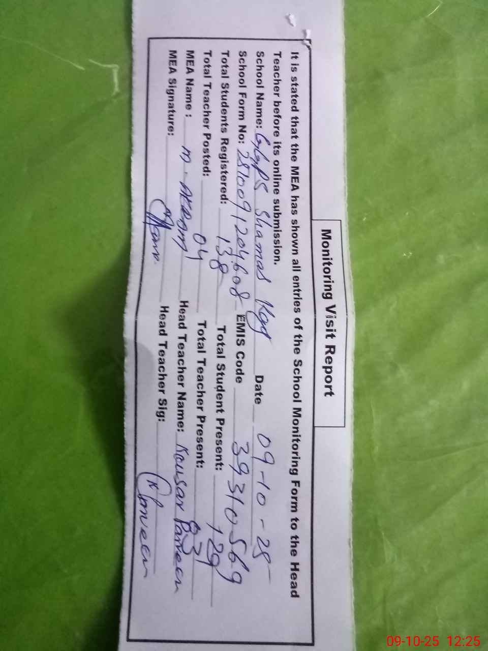 | Attendance Register | Head Teacher | MEA with School | Visit Proof |