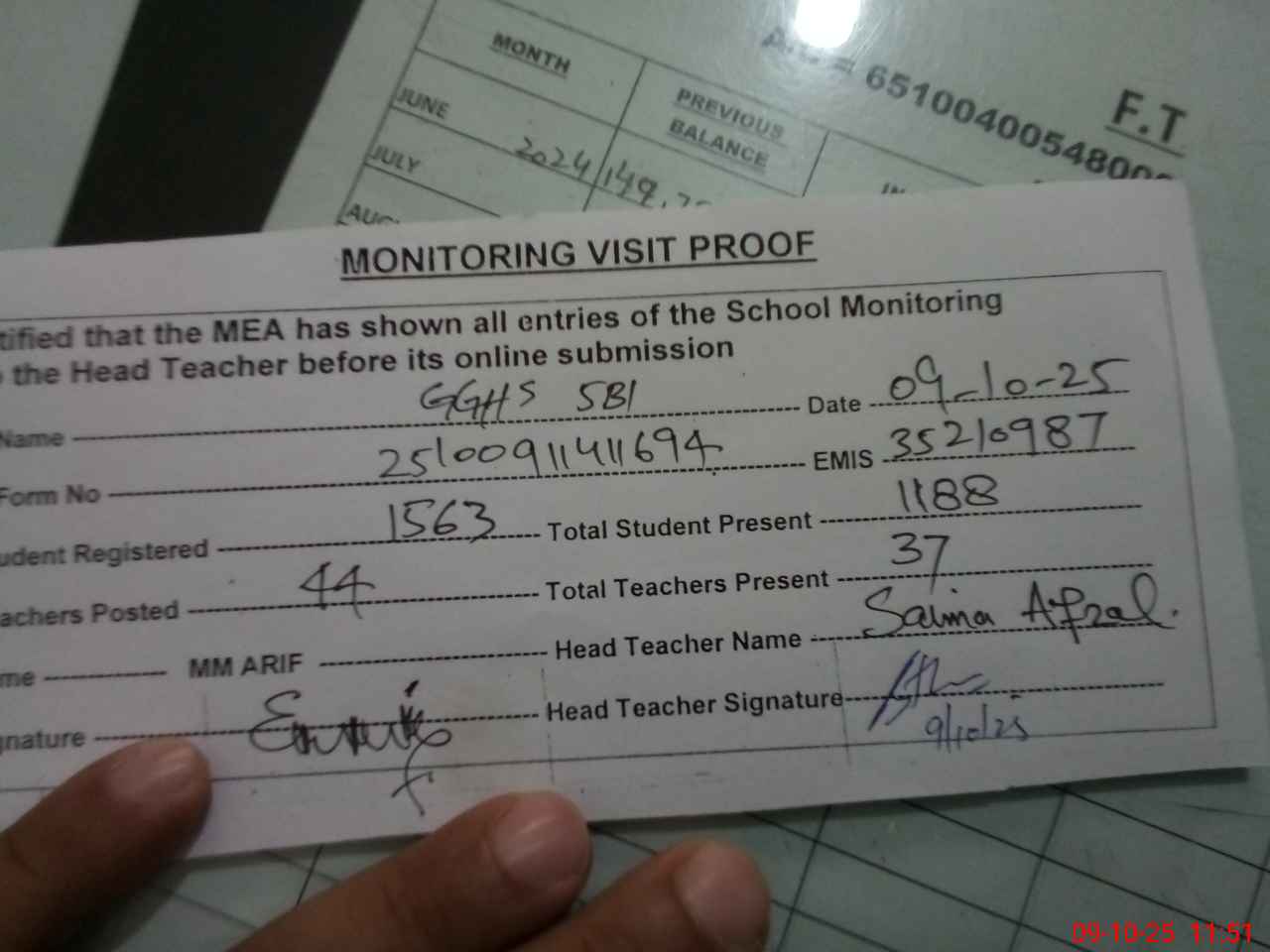 | Monitoring Date: 09-10-2025 | Start Time: 09-10-2025 10:34 AM | End Time: 09-10-2025 11:51 AM | Name of MEA: MU**** AR**** (N**** | |