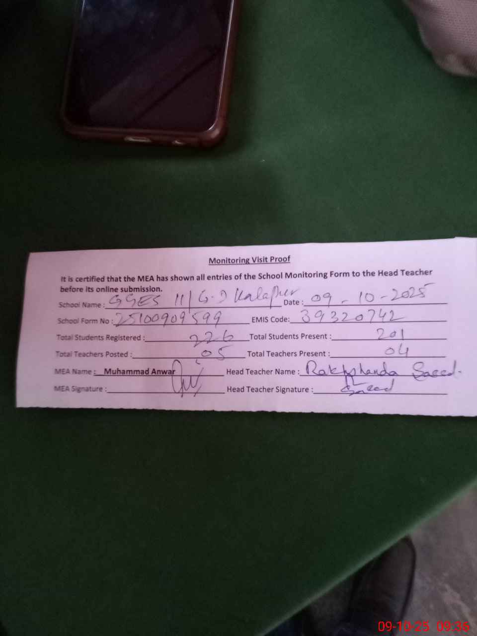 | Monitoring Date: 09-10-2025 | Start Time: 09-10-2025 09:09 AM | End Time: 09-10-2025 09:37 AM | Name of MEA: MU**** AN**** | |