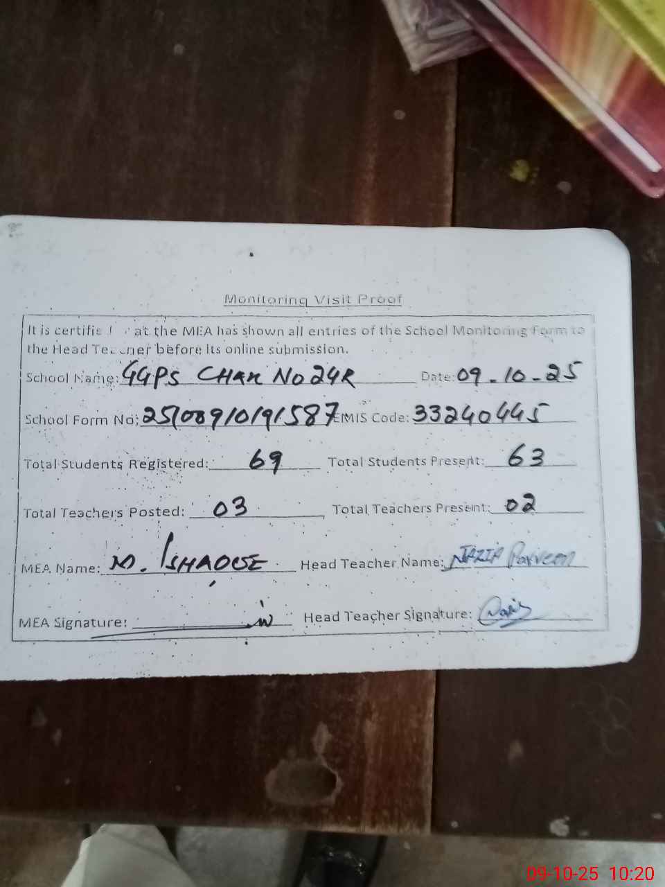 | Attendance Register | Head Teacher | MEA with School | Visit Proof |