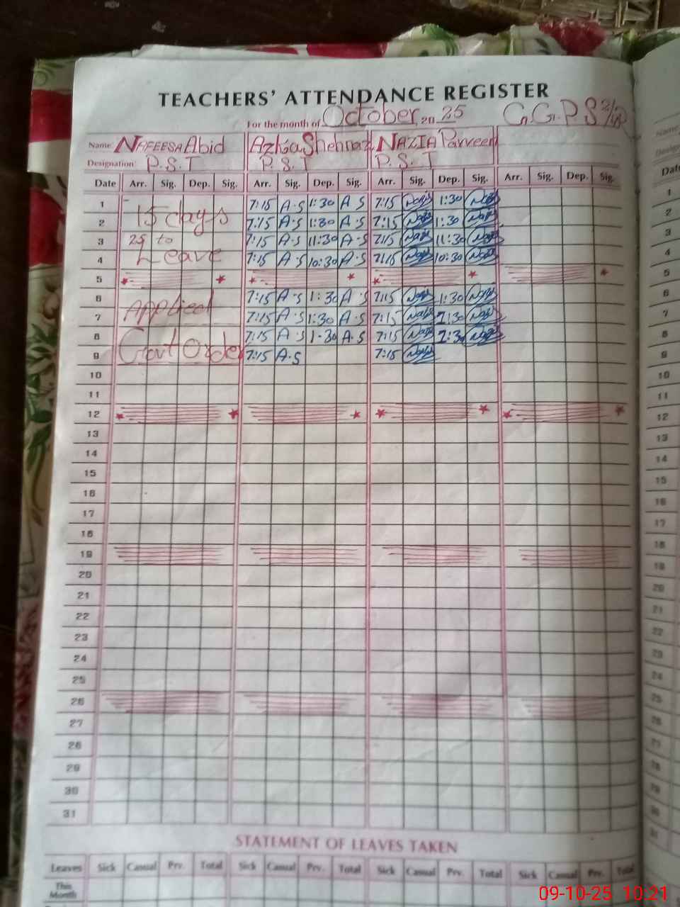 | Leave | Duty | Absent | Maternity | Medical | Ex- Pak |