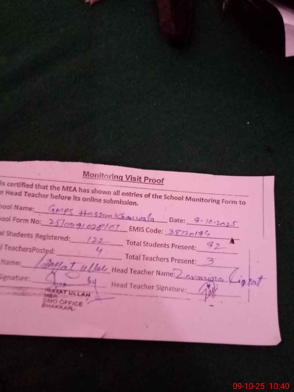 | Certified that this School was Inspected by the Undersigned MEA/DMO Today and the Information Stated Above is as Per Record. | |||||