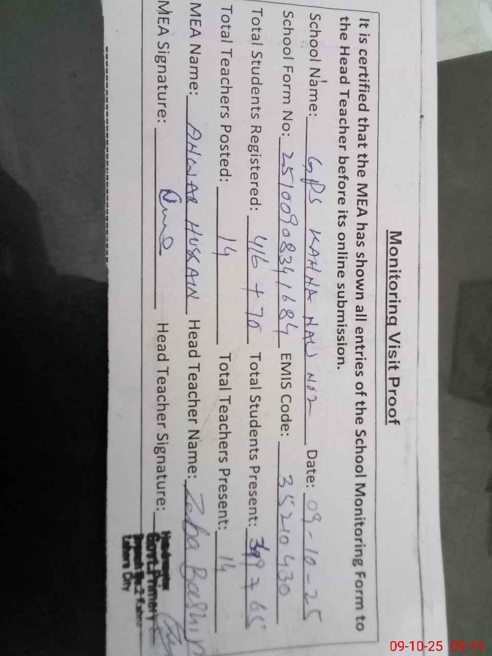 | Certified that this School was Inspected by the Undersigned MEA/DMO Today and the Information Stated Above is as Per Record. | |||||