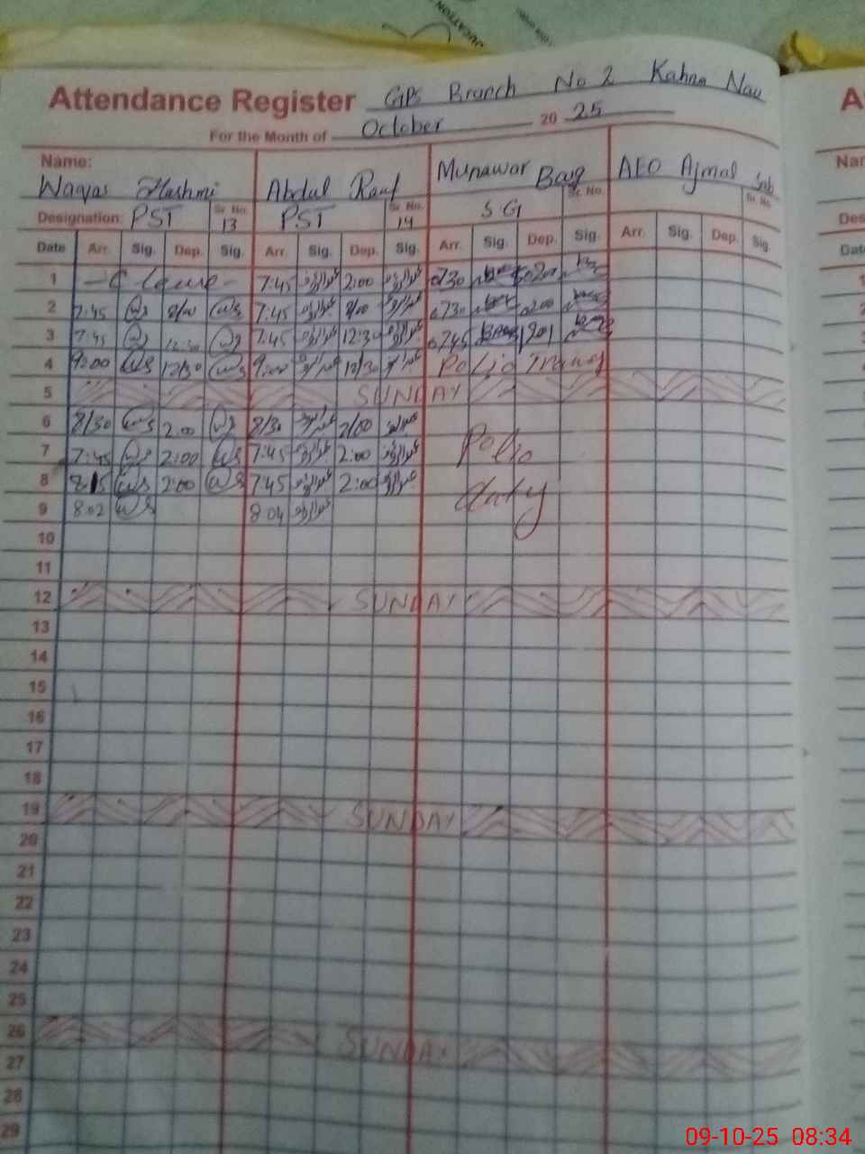 | Remarks (Use Separate Page if Required): Munawar Baig as per attendance register on official duty but valid authority not available so Mark absent 35210430 | |||||