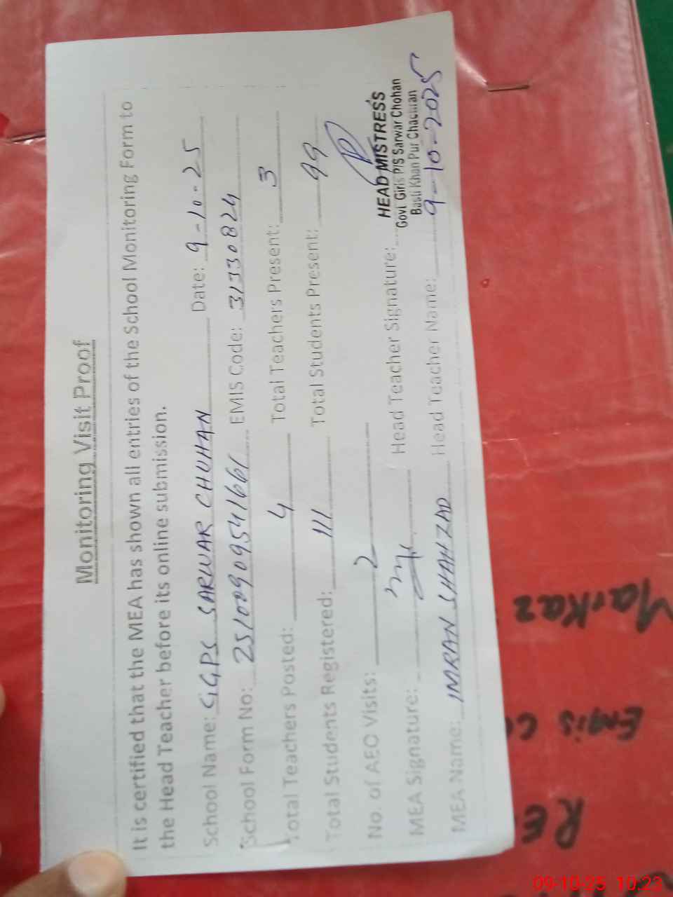 | Attendance Register | Head Teacher | MEA with School | Visit Proof |