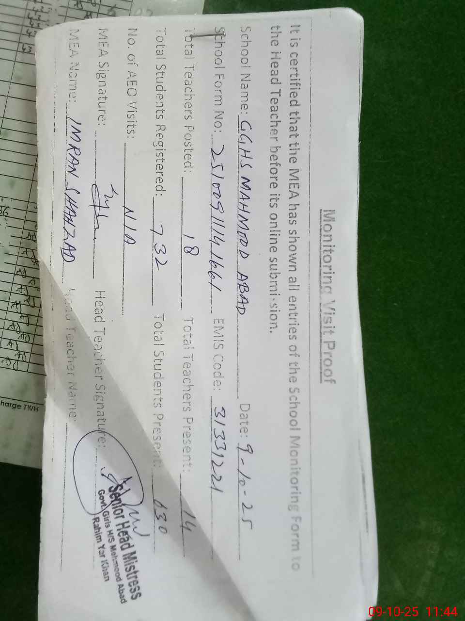 | Certified that this School was Inspected by the Undersigned MEA/DMO Today and the Information Stated Above is as Per Record. | |||||