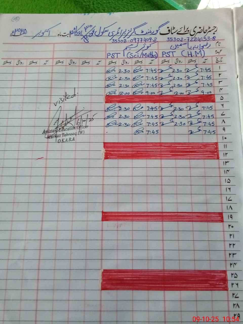| Name: RI**** YA**** Designation: (School Headmaster's/Headmistress's) PST Phone/Cell Number: 03**** |