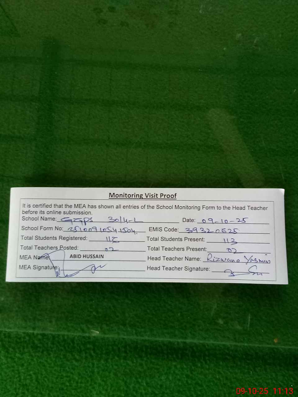 | Certified that this School was Inspected by the Undersigned MEA/DMO Today and the Information Stated Above is as Per Record. | |||||