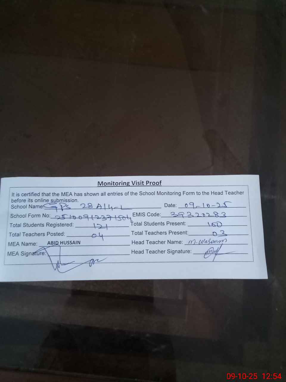 | Attendance Register | Head Teacher | MEA with School | Visit Proof |