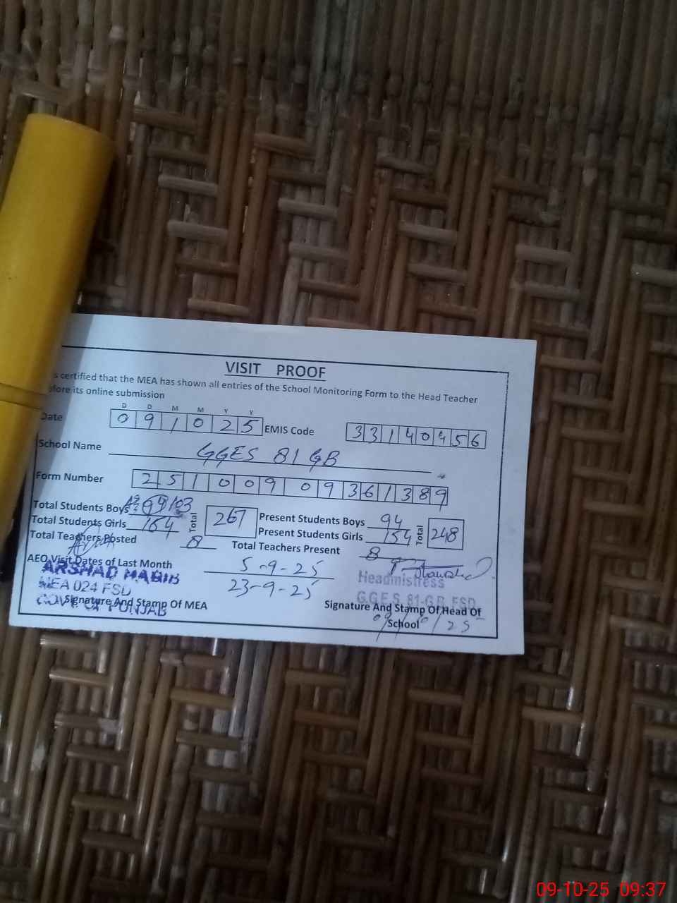 | Attendance Register | Head Teacher | MEA with School | Visit Proof |