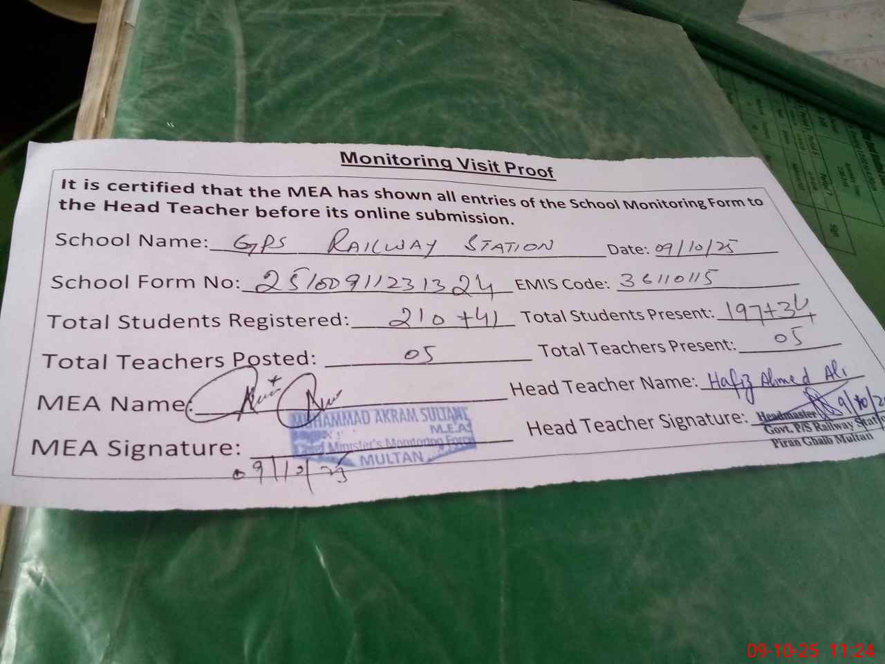 | Monitoring Date: 09-10-2025 | Start Time: 09-10-2025 10:59 AM | End Time: 09-10-2025 11:29 AM | Name of MEA: MU**** AK**** | |