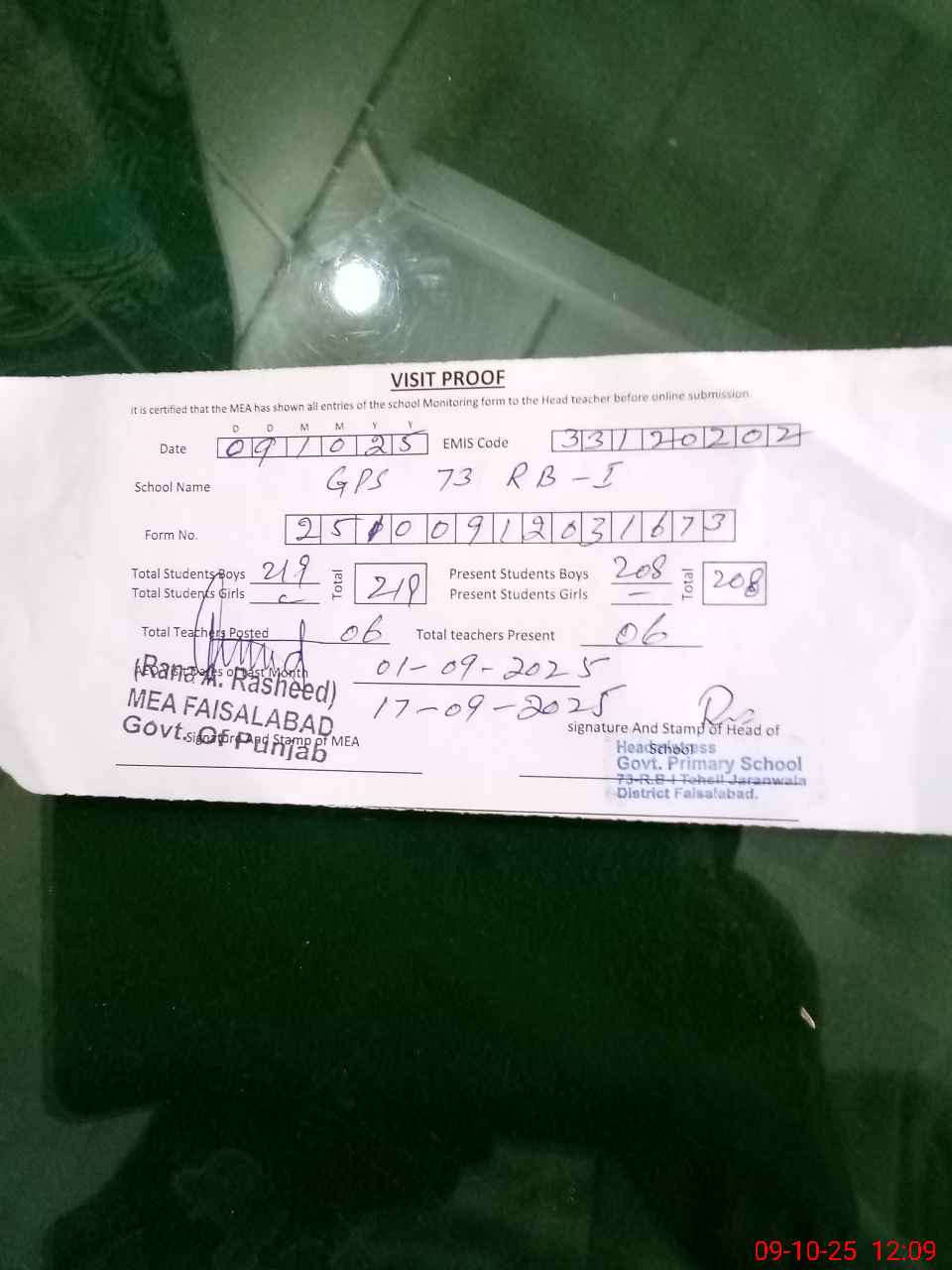 | EMIS Code: 33120202 | Name of School: GPS CHAK 73 RB I | |||