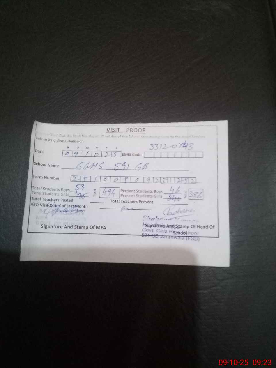 | Attendance Register | Head Teacher | MEA with School | Visit Proof |