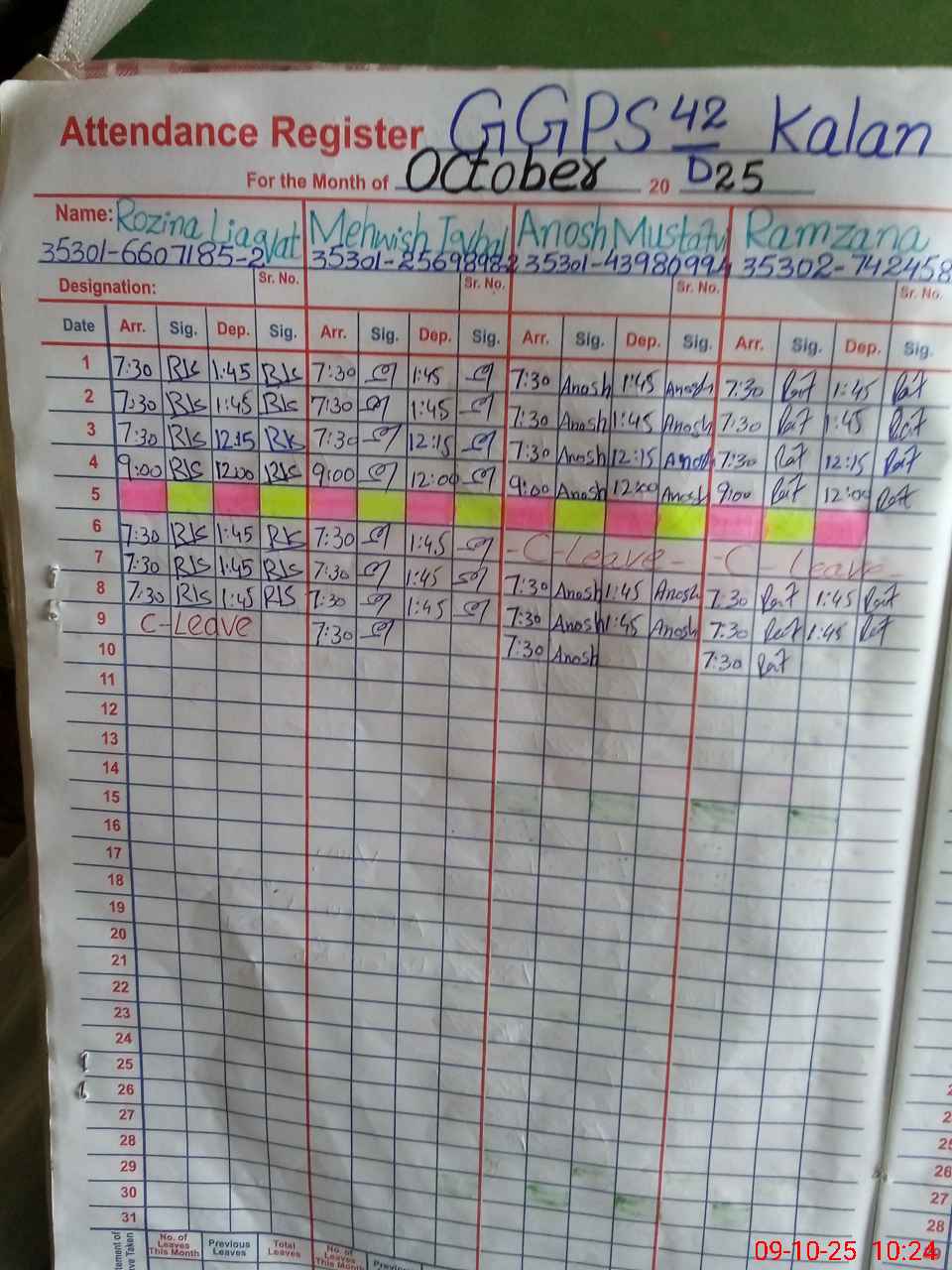 | CNIC | Full Name | Designation | R/C | Absence during last cal. month |
