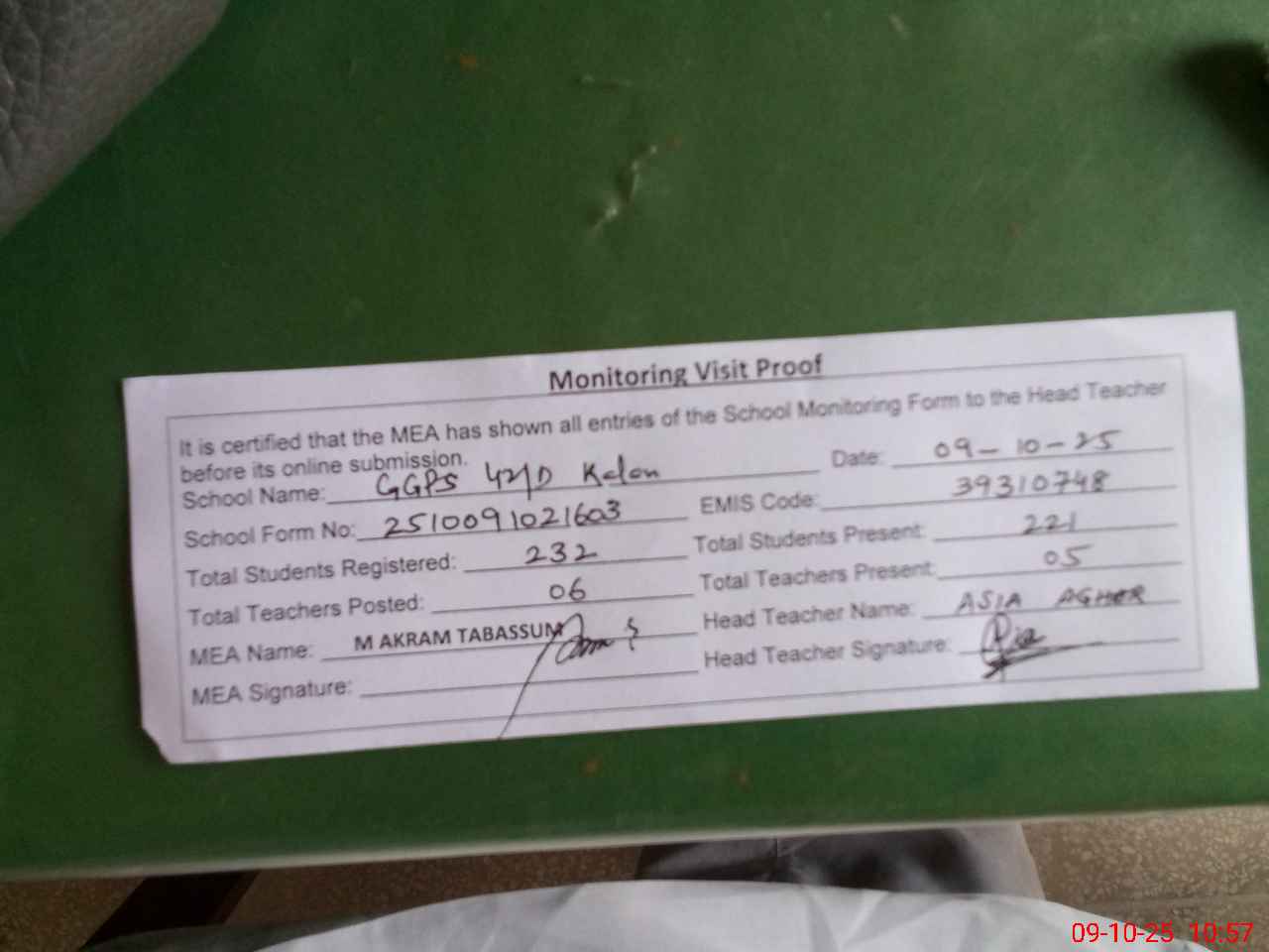 | Monitoring Date: 09-10-2025 | Start Time: 09-10-2025 10:20 AM | End Time: 09-10-2025 10:58 AM | Name of MEA: MU**** AK**** TA**** | |