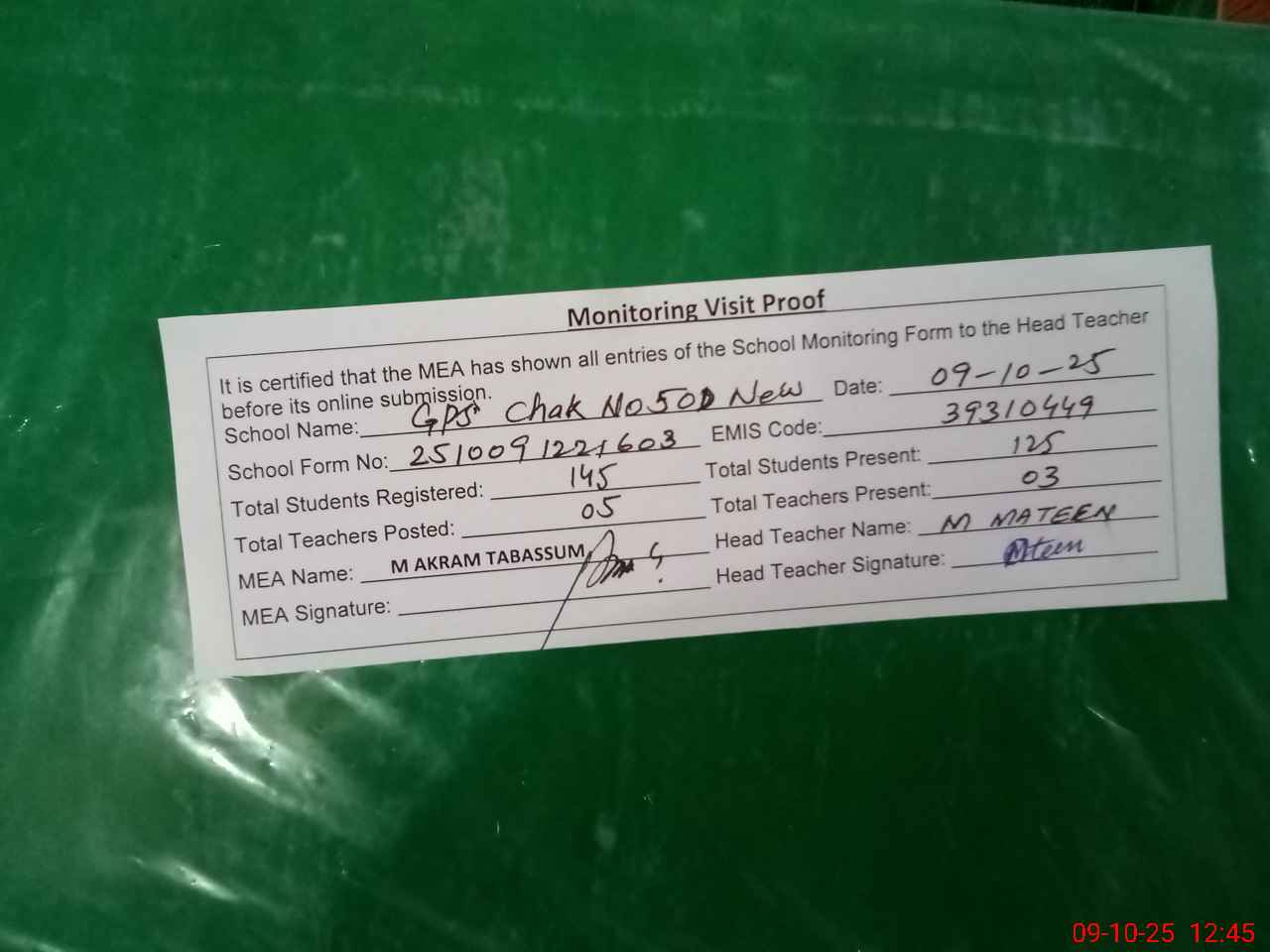 | EMIS Code: 39310449 | Name of School: GPS CHAK NO. 50-D NEW | |||