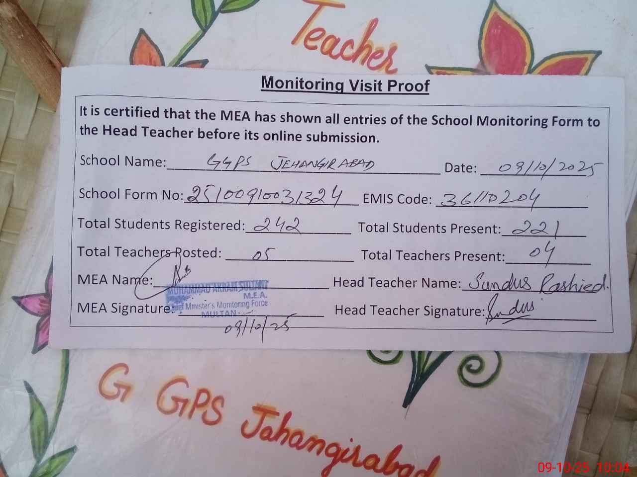 | EMIS Code: 36110204 | Name of School: GGPS JAHANGIR ABAD MULTAN | |||