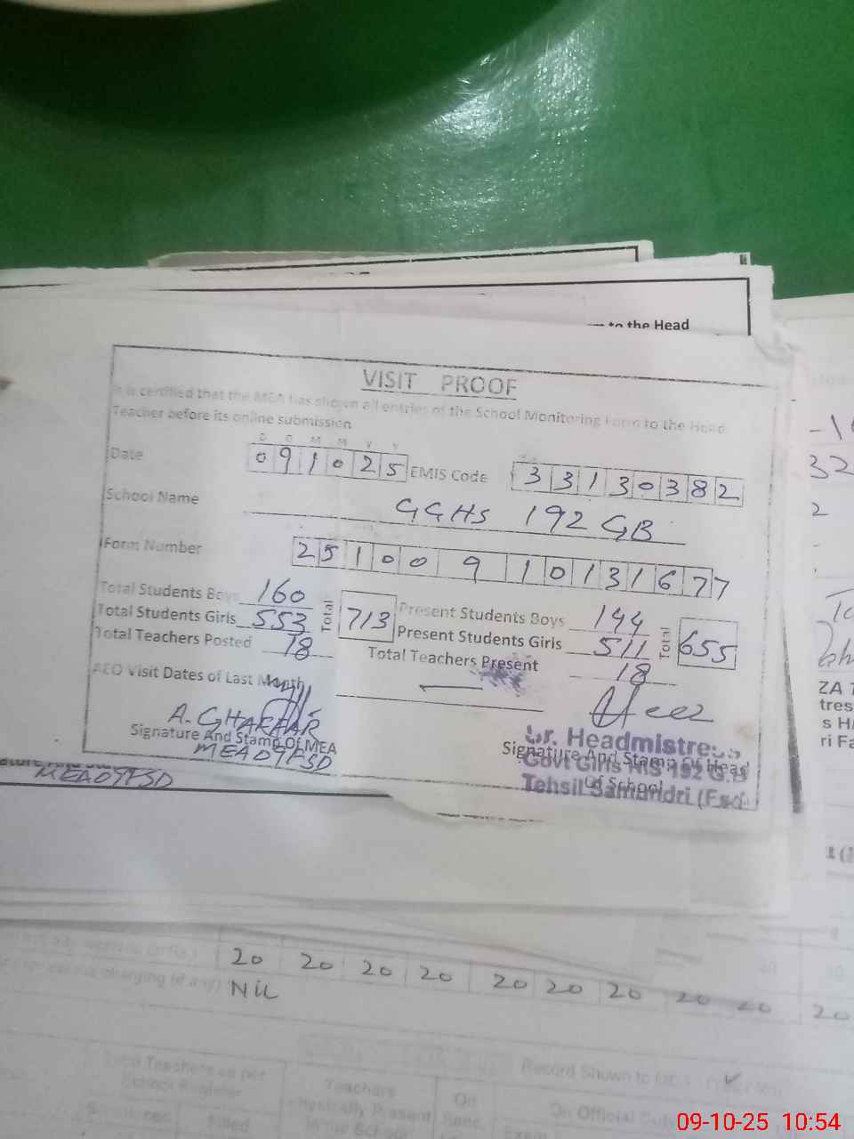 | Attendance Register | Head Teacher | MEA with School | Visit Proof |