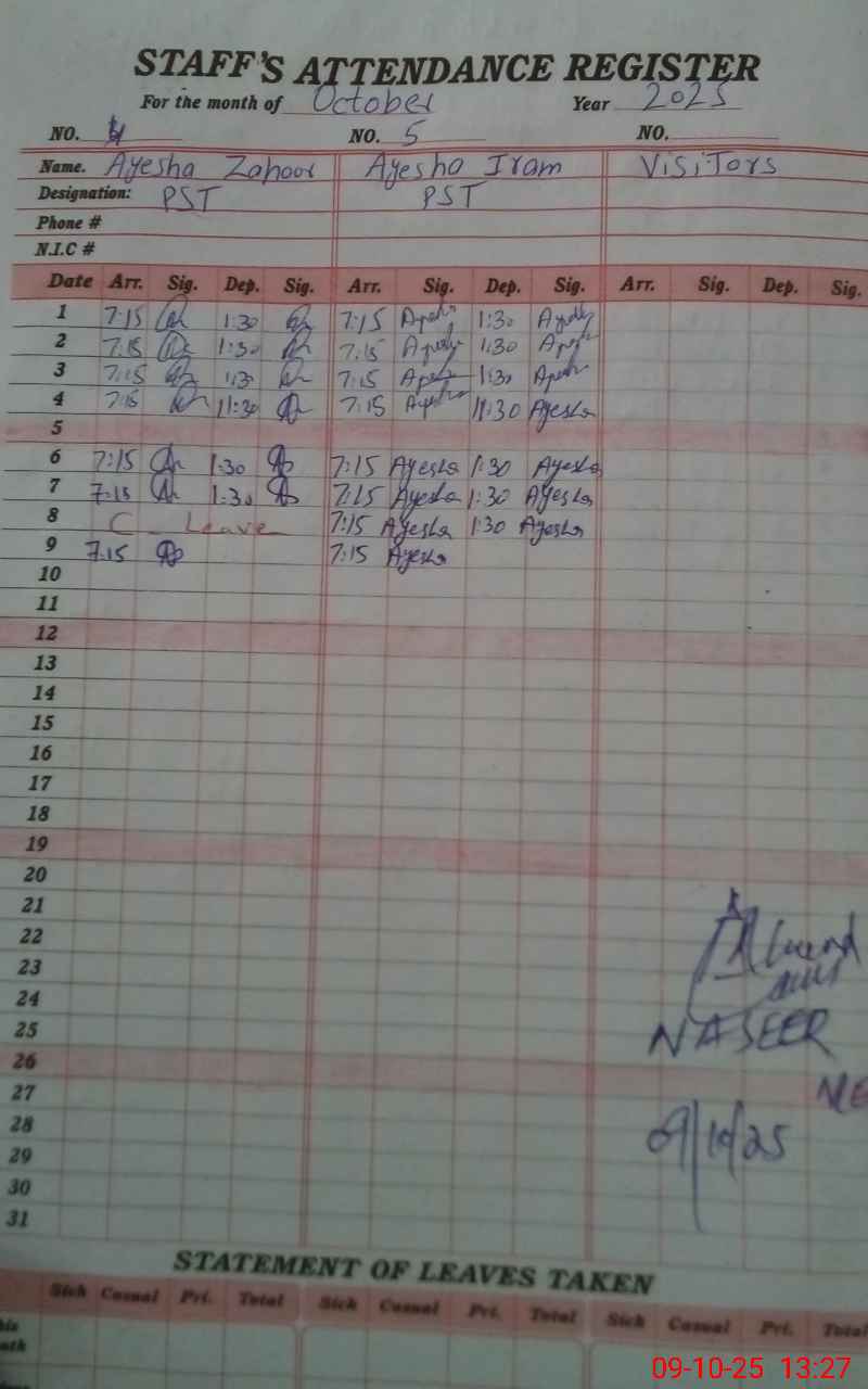 | CNIC | Full Name | Designation | R/C | Absence During Last Calender Month |