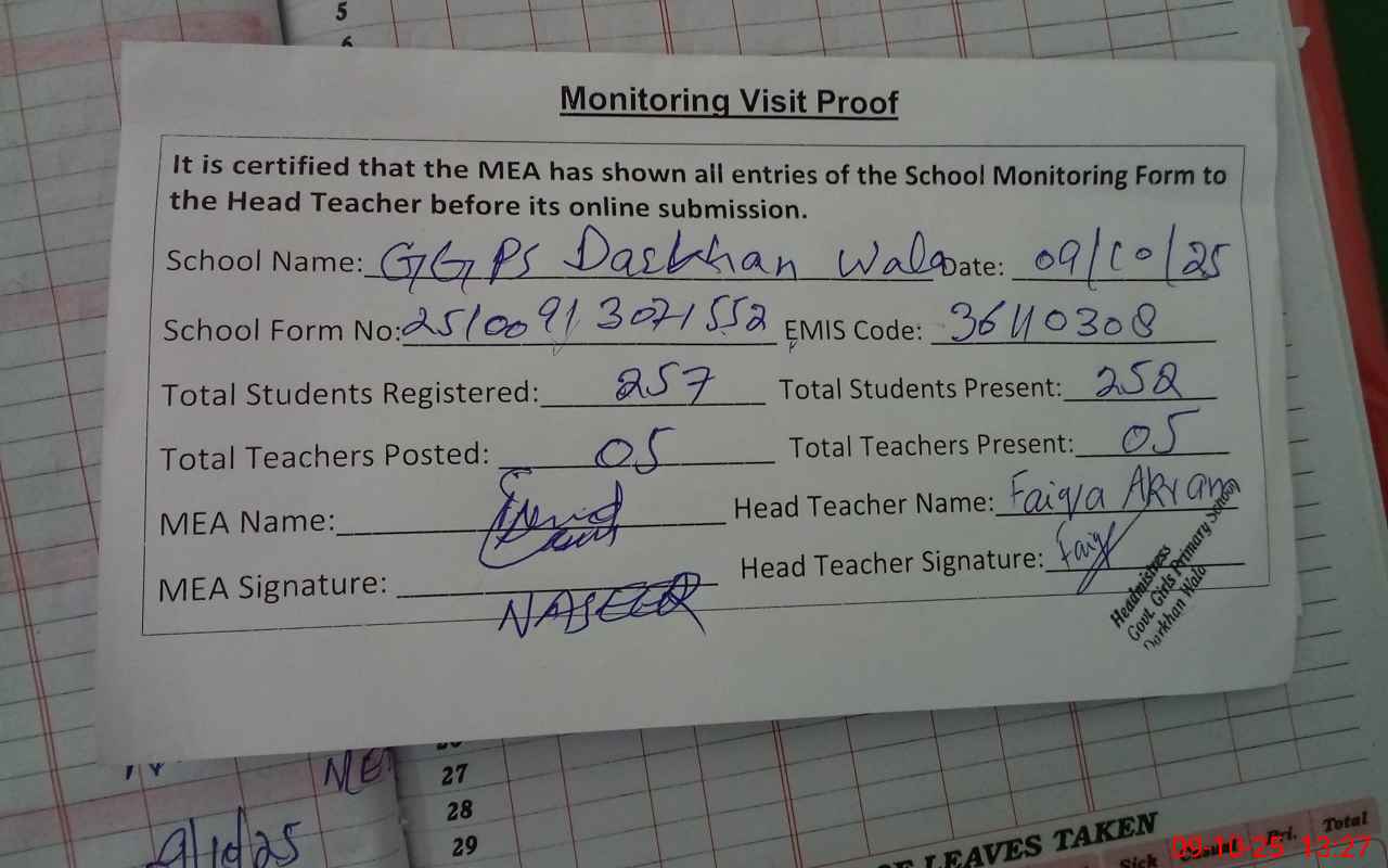 | EMIS Code: 36110308 | Name of School: GGPS DARKHAN WALA SHER SHAH ROAD | |||