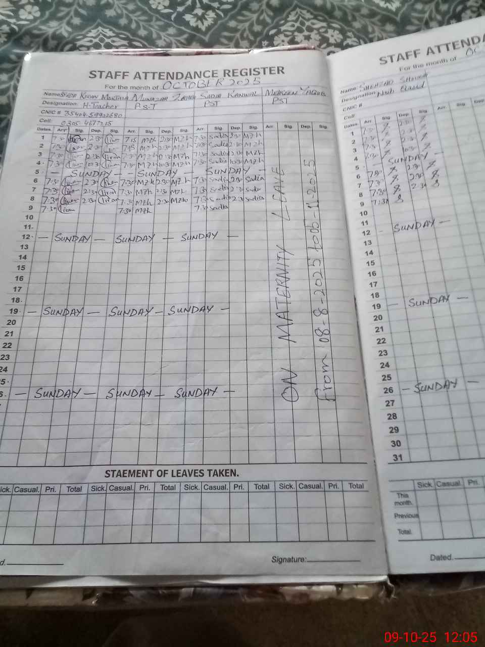 | Remarks (Use Separate Page if Required): PST Teacher Iqra Manzoor resignation was approved wef 31st August 2023 by order no 1687 Dated 7th August 2023 by office of DEO WEE Lahore but her name in PMIU Monthly Monitoring application teaching staff list of said school is still exists PST teacher Mehreen Yaqoob Awan is on metrinity leave wef 8th August 2025 to 5th November 2025 for 90 days by order no 13423990 Lhr 2025 dated 22nd September 2025 ECE class is accommodated in nursery classroom due to shortage of teaching staff Last NSB fund status not available on SIS Due to rain in last month two classes slabs of roofs affected now required to replace affected slabs 35220291 | |||||