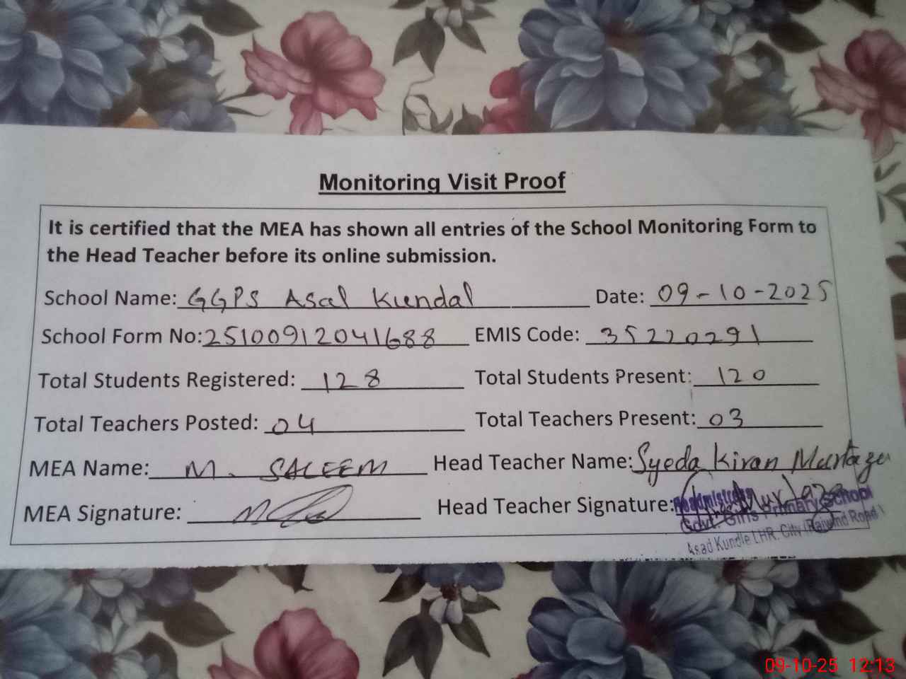| EMIS Code: 35220291 | Name of School: GGPS ASAL KUNDAL | |||