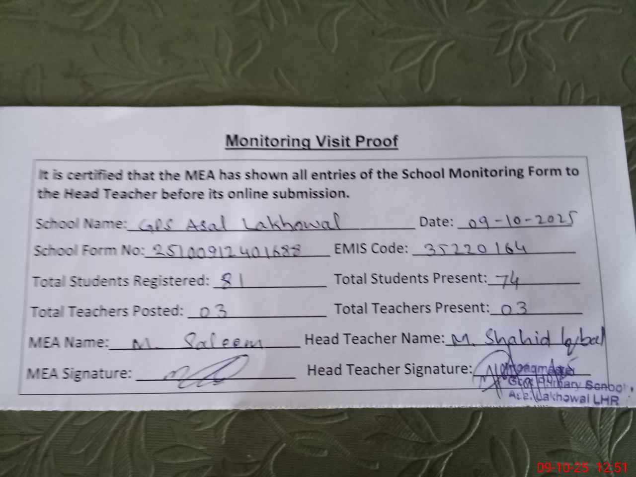 | Certified that this School was Inspected by the Undersigned MEA/DMO Today and the Information Stated Above is as Per Record. | |||||