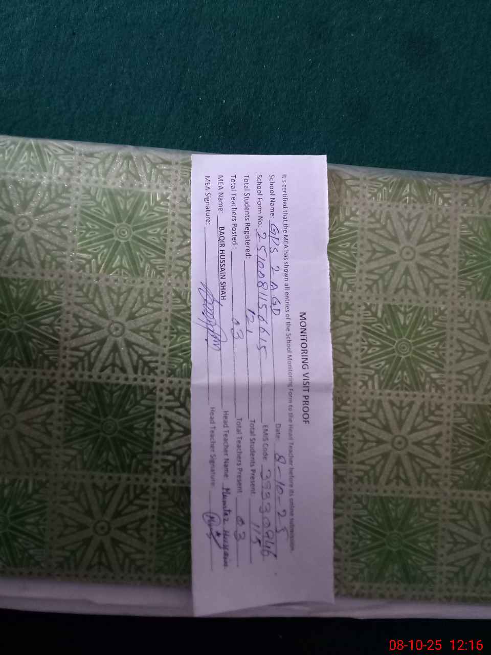 | Attendance Register | Head Teacher | MEA with School | Visit Proof |