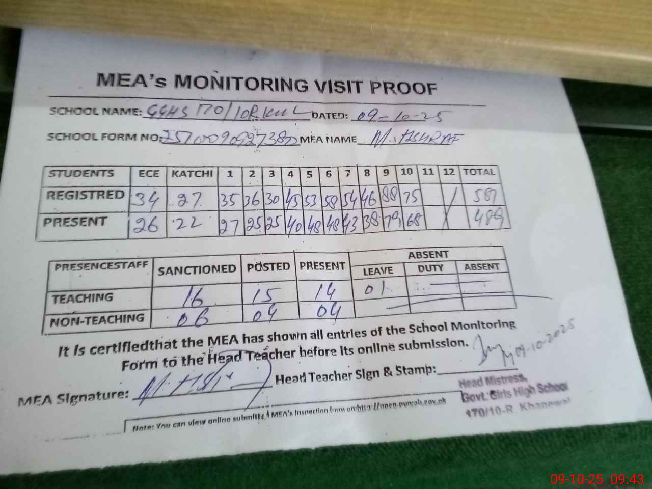 | EMIS Code: 36420094 | Name of School: GGHS 170/10-R, KHANEWAL | |||