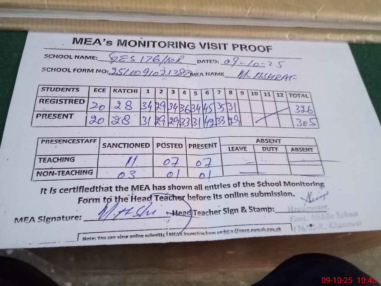 | EMIS Code: 36420068 | Name of School: GES 176/10-R, KHANEWAL | |||