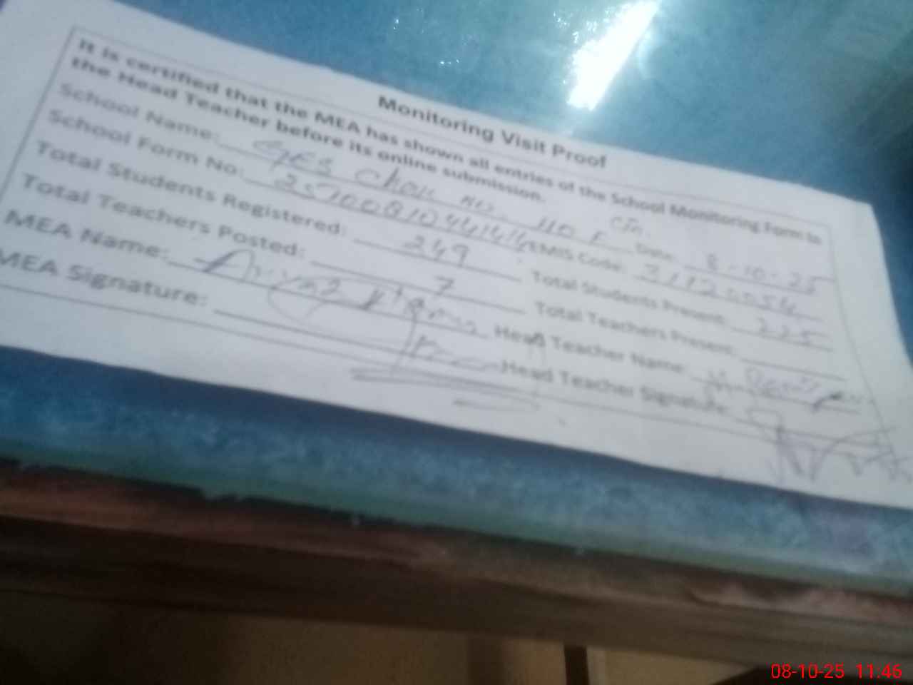 | Attendance Register | Head Teacher | MEA with School | Visit Proof |