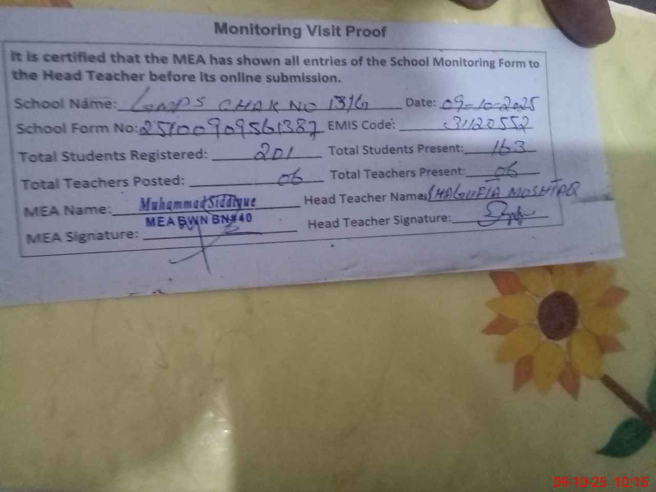 | EMIS Code: 31120552 | Name of School: GMPS CHAK 13 GAJIANI A | |||