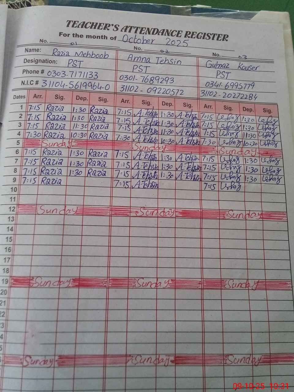 | CNIC | Full Name | Designation | R/C | Absence during last cal. month |