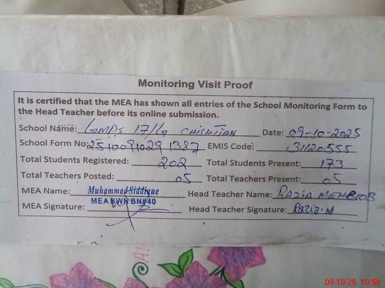 | Certified that this School was Inspected by the Undersigned MEA/DMO Today and the Information Stated Above is as Per Record. | |||||