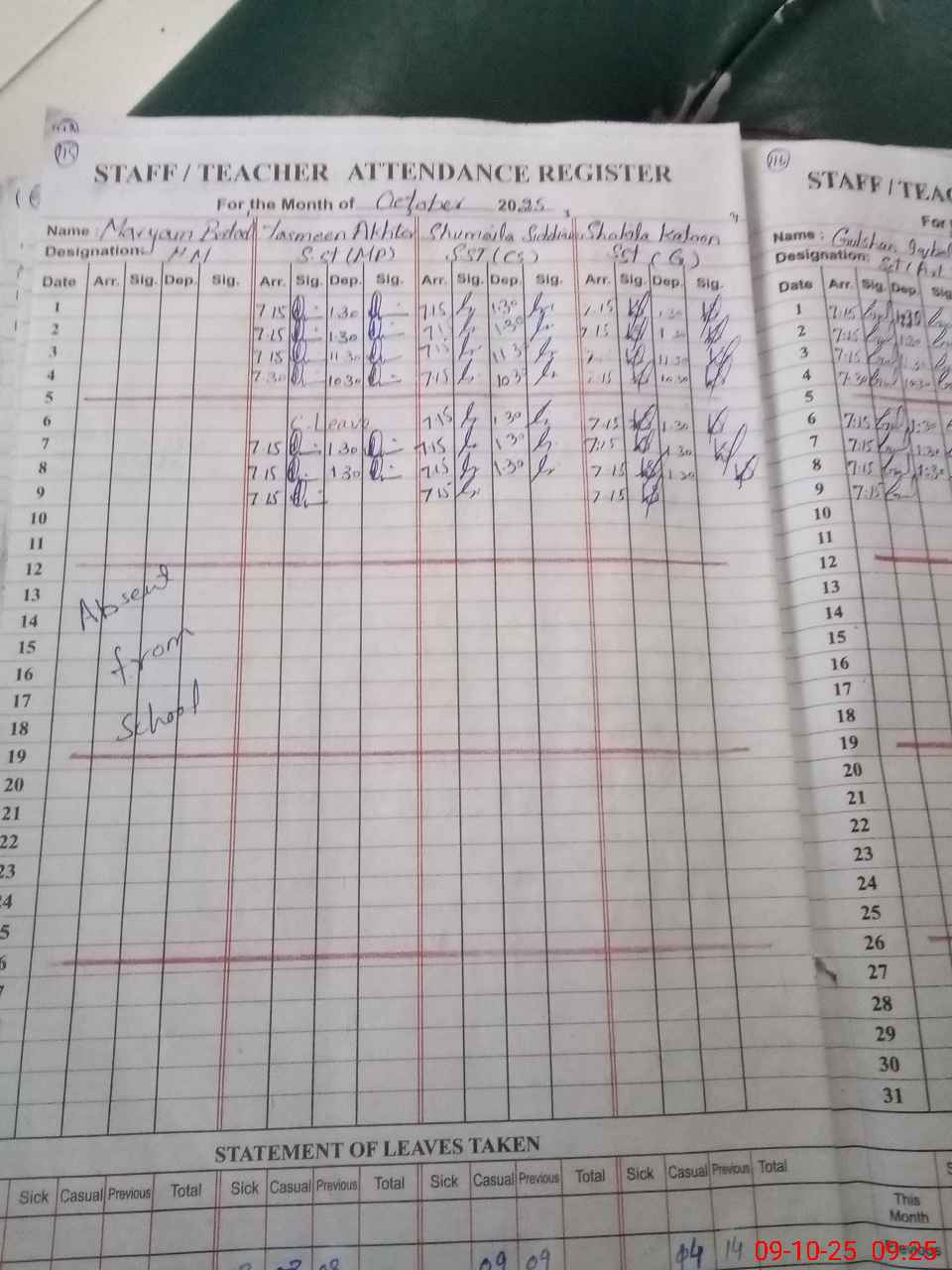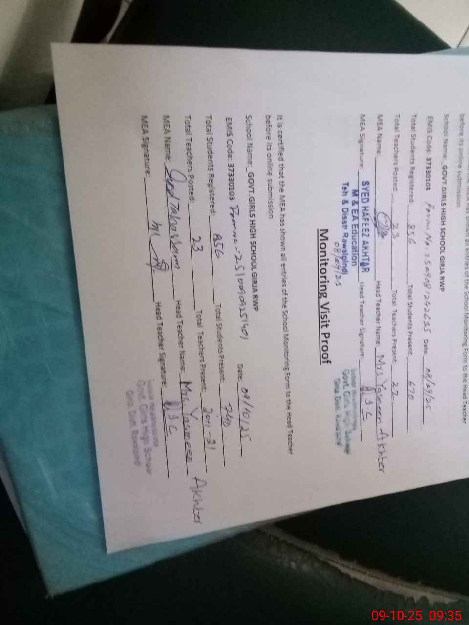 | Remarks (Use Separate Page if Required): Nsb not updated on sis after October 2024 Teacher Azra prveen pst not tage on school sis she is present in school total teacher in school is 23 | |||||