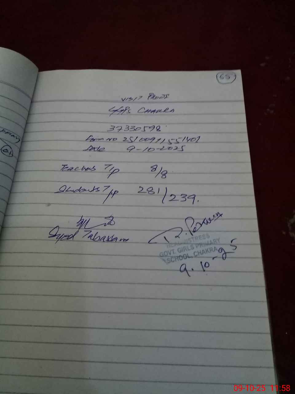 | Name: RI**** PE**** Designation: (School Headmaster's/Headmistress's) PST Phone/Cell Number: 03**** |