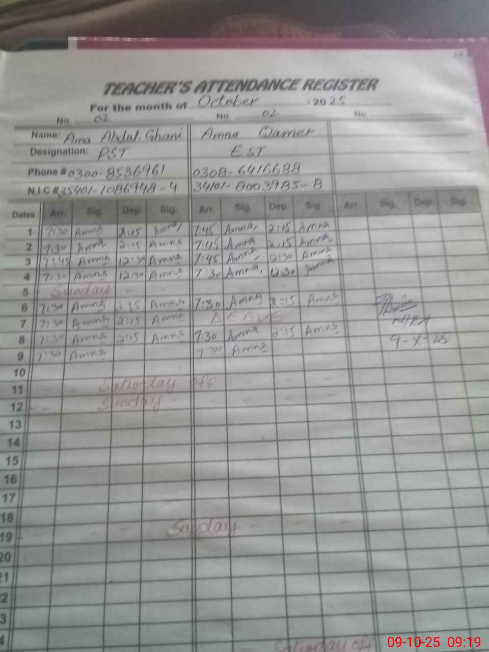 | CNIC | Full Name | Designation | R/C | Absence during last cal. month |