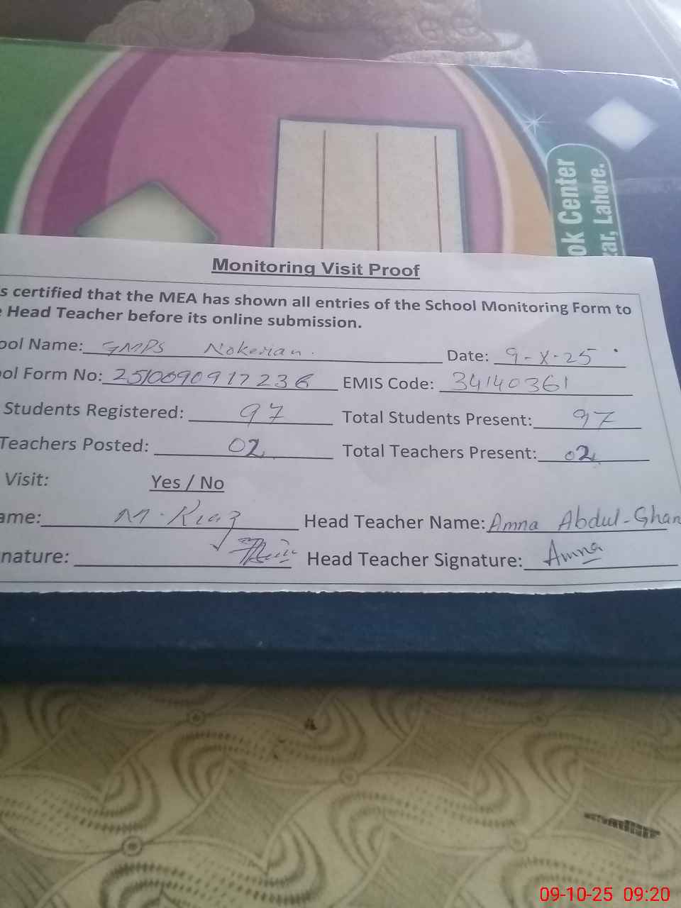 | Attendance Register | Head Teacher | MEA with School | Visit Proof |