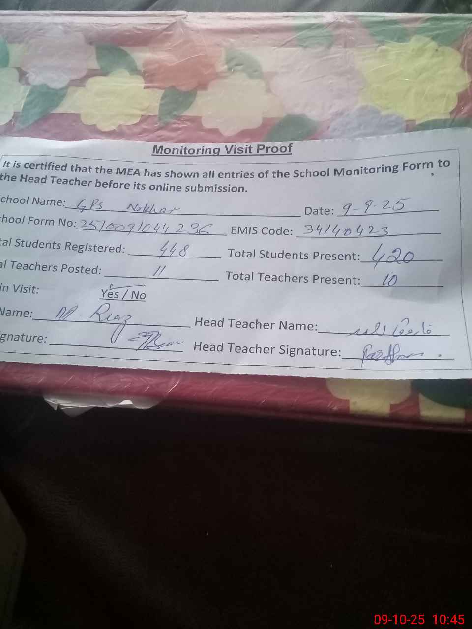 | Attendance Register | Head Teacher | MEA with School | Visit Proof |